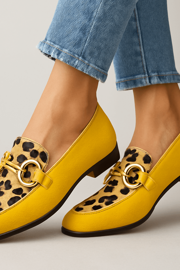 The Sonia loafer is where bold meets beautiful. Featuring a sunshine-yellow body, fierce leopard-print upper, and glossy gold hardware, Sonia is designed to make a confident statement. It’s the perfect blend of vibrant colour, wild texture, and timeless loafer elegance—ideal for days when you want your outfit to do the talking. Lightweight, comfortable, and full of personality, Sonia adds instant flair to any look. From casual denim to monochrome fits, this is your go-to accent piece for elevated everyday style.