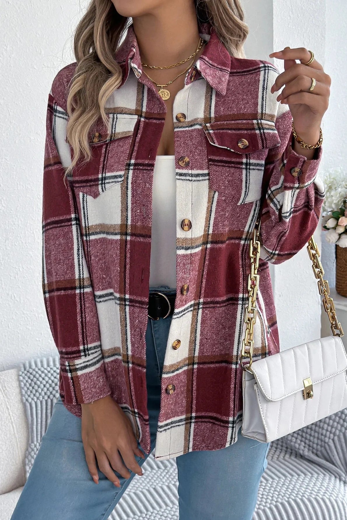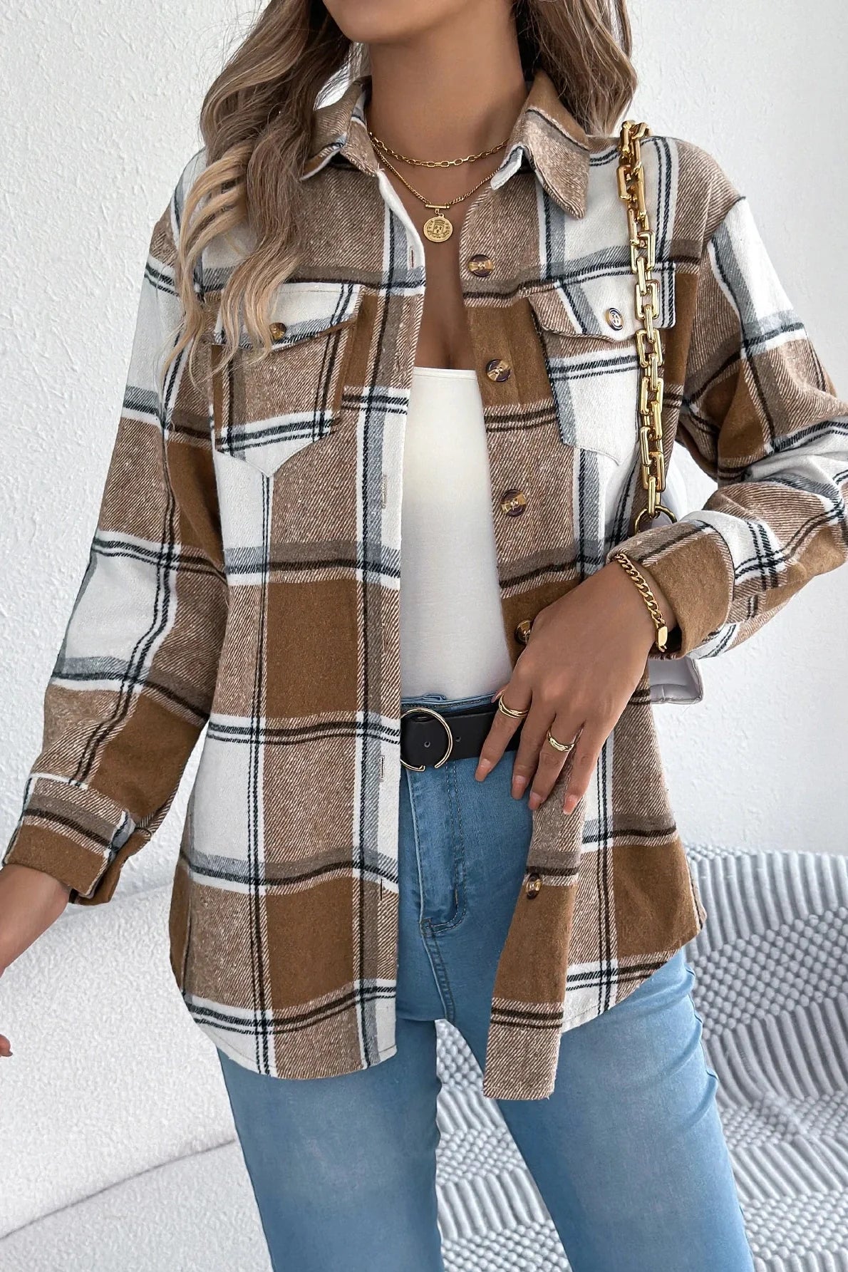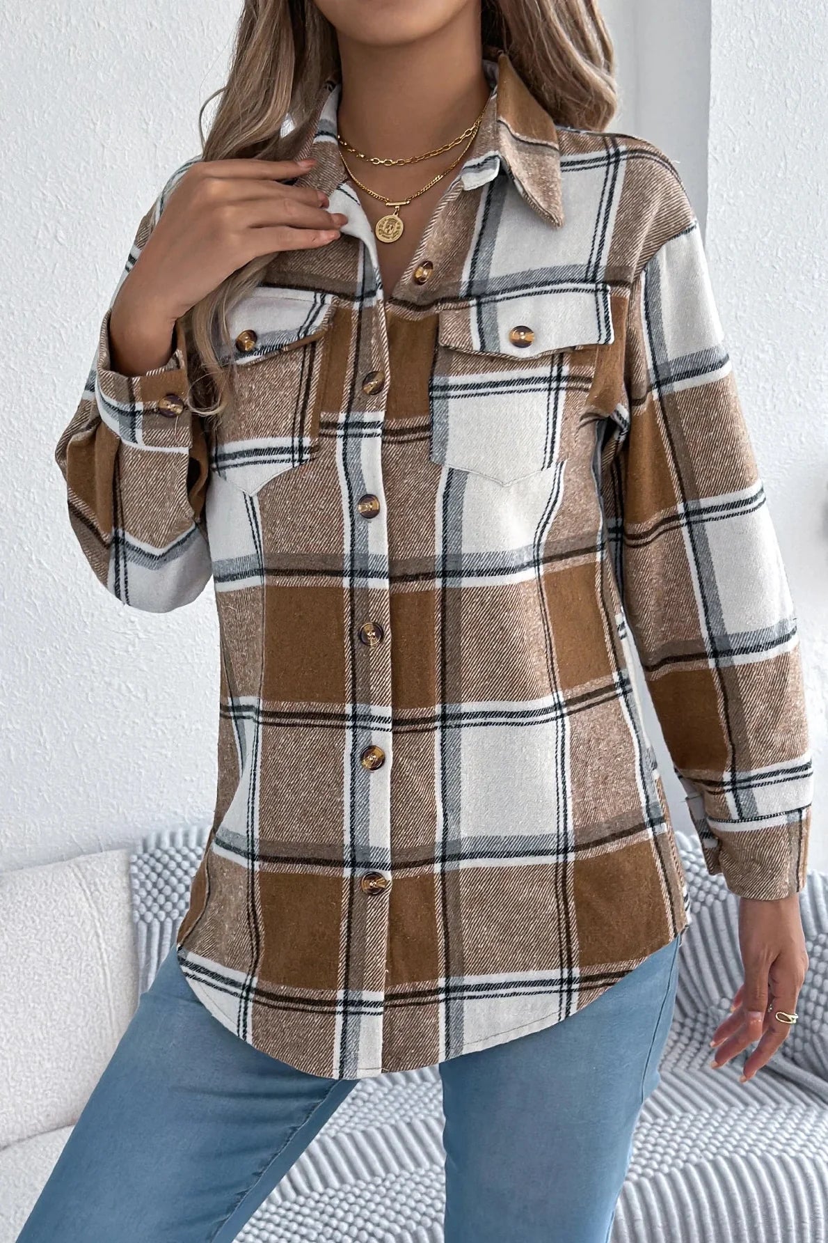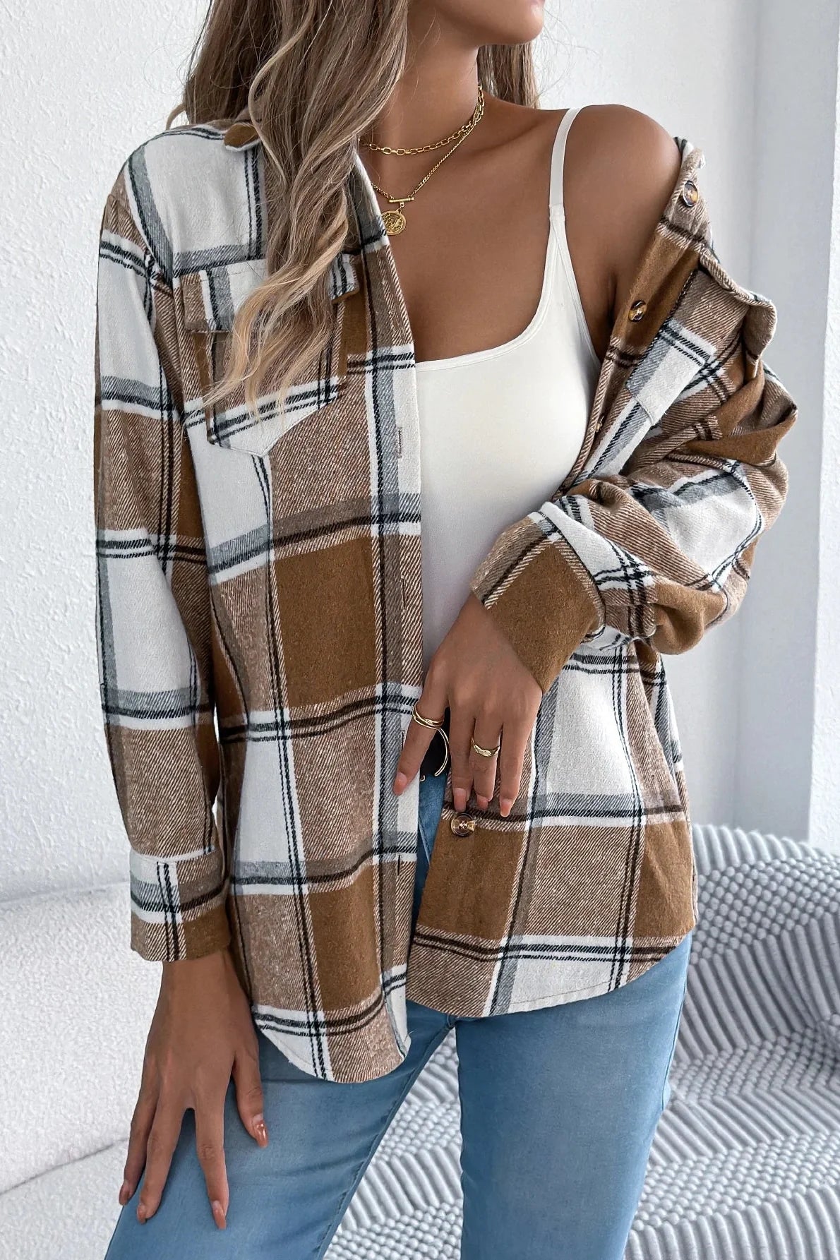 The Celeste – Light Jacket blends cozy charm with effortless style, giving you a laid-back yet polished look for cooler days. With its soft brushed fabric, oversized plaid pattern, and neutral-meets-color tone palette, it’s your go-to for layering over basics or pairing with denim. Whether you're heading to brunch, school pickup, or an autumn stroll, the Celeste adds just the right touch of comfort and trend. Thoughtfully designed with button-up closure, a chest pocket, and a flattering relaxed silhouette, it wraps you in warmth without feeling bulky. A wardrobe staple you’ll reach for again and again.